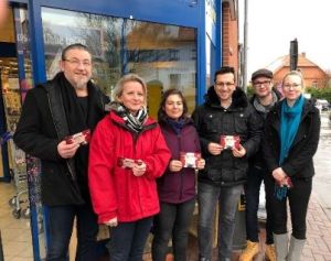 Die Jugendabteilung der SPD hat sich am 22.12.18 vor Supermärkten in Ronnenberg zusammengefunden, um den Bürgern mit einer netten Grußkarte und einem Schockoladenweihnachtsmann den stressigen Festtagseinkauf zu versüßen.